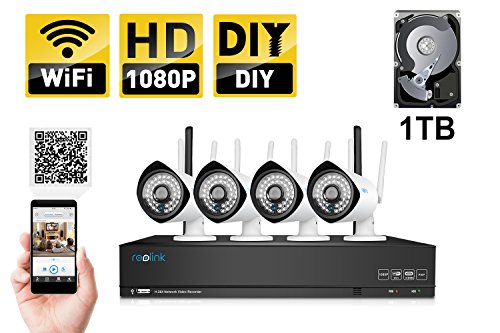 Wireless Home Security Camera System , Reolink 4CH Full HD 1080P Video Security System , 4pcs 1080P WIFI Outdoor bullet IP Camera ,65-100ft Night Vision, 60ft Power ext. Cable ,1TB HDD (RLK4-210WB4)