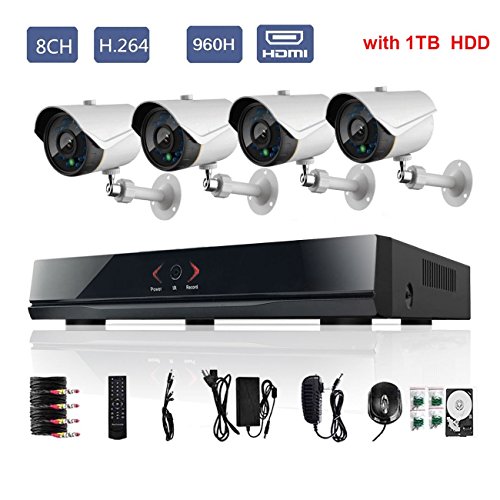 TECBOX 4 CH Channel 960H HDMI CCTV DVR Home Security Camera System with 4 800TVL Indoor/ Outdoor Night Vision Waterproof Security Cameras 1TB HDD Installed
